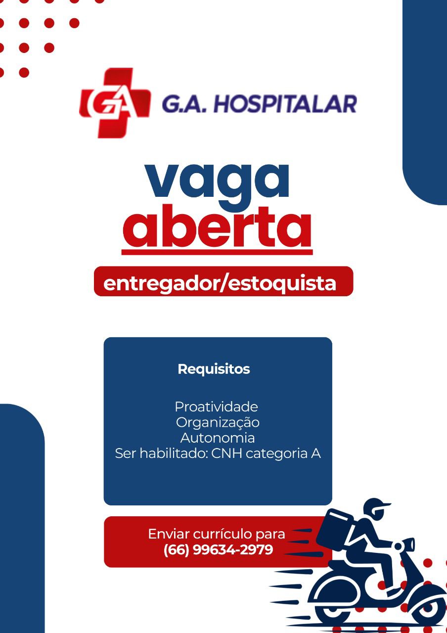 Empresa: GA Hospitalar Vaga de Emprego: Entregador/Estoquista E-mail: balcao@cdlaf.com.br Fone: (66) 3521-2591