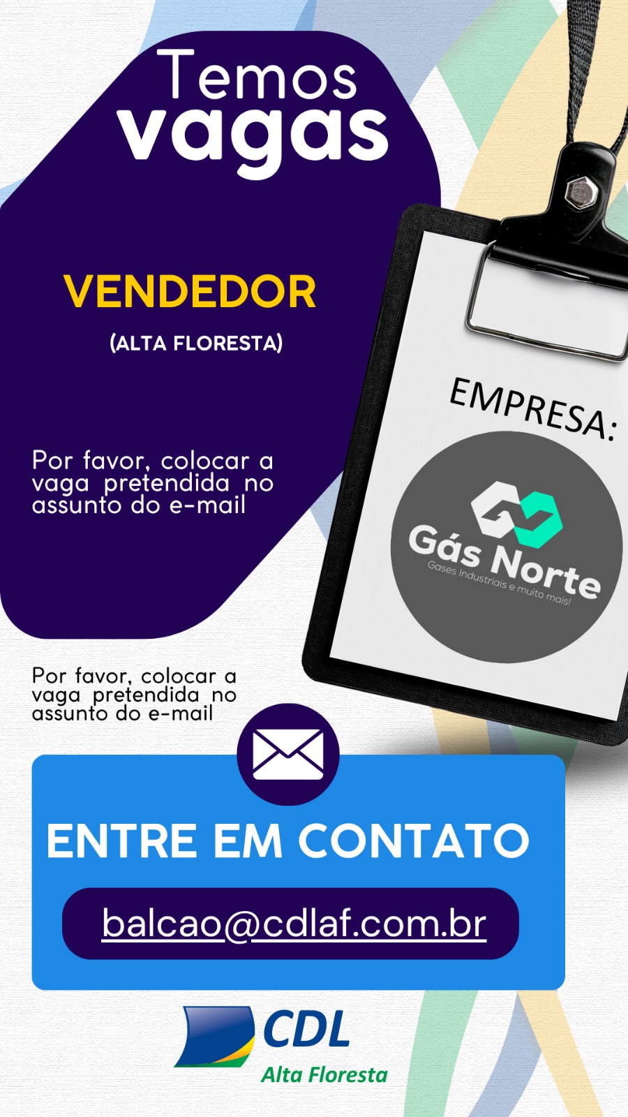 Empresa: Gás Norte Vaga de Emprego: Vendedor E-mail: balcao@cdlaf.com.br Fone: (66) 3521-2591