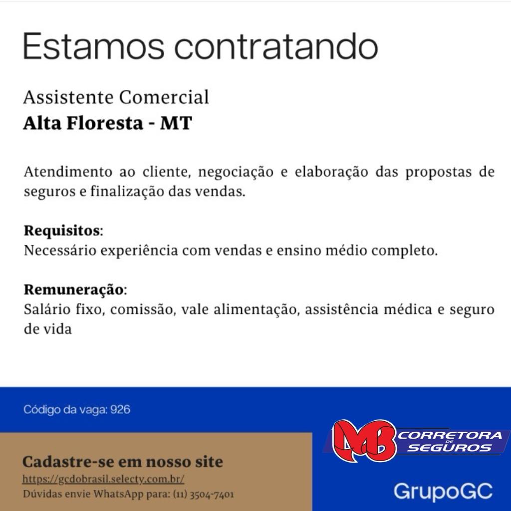 Empresa: MB Seguros Vaga de Emprego: Assistente Comercial E-mail: balcao@cdlaf.com.br Fone: (66) 3521-2591