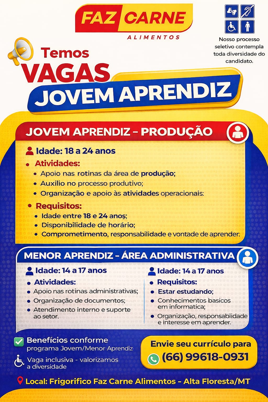 TEMOS VAGAS – JOVEM APRENDIZ | FAZ CARNE ALIMENTOS
